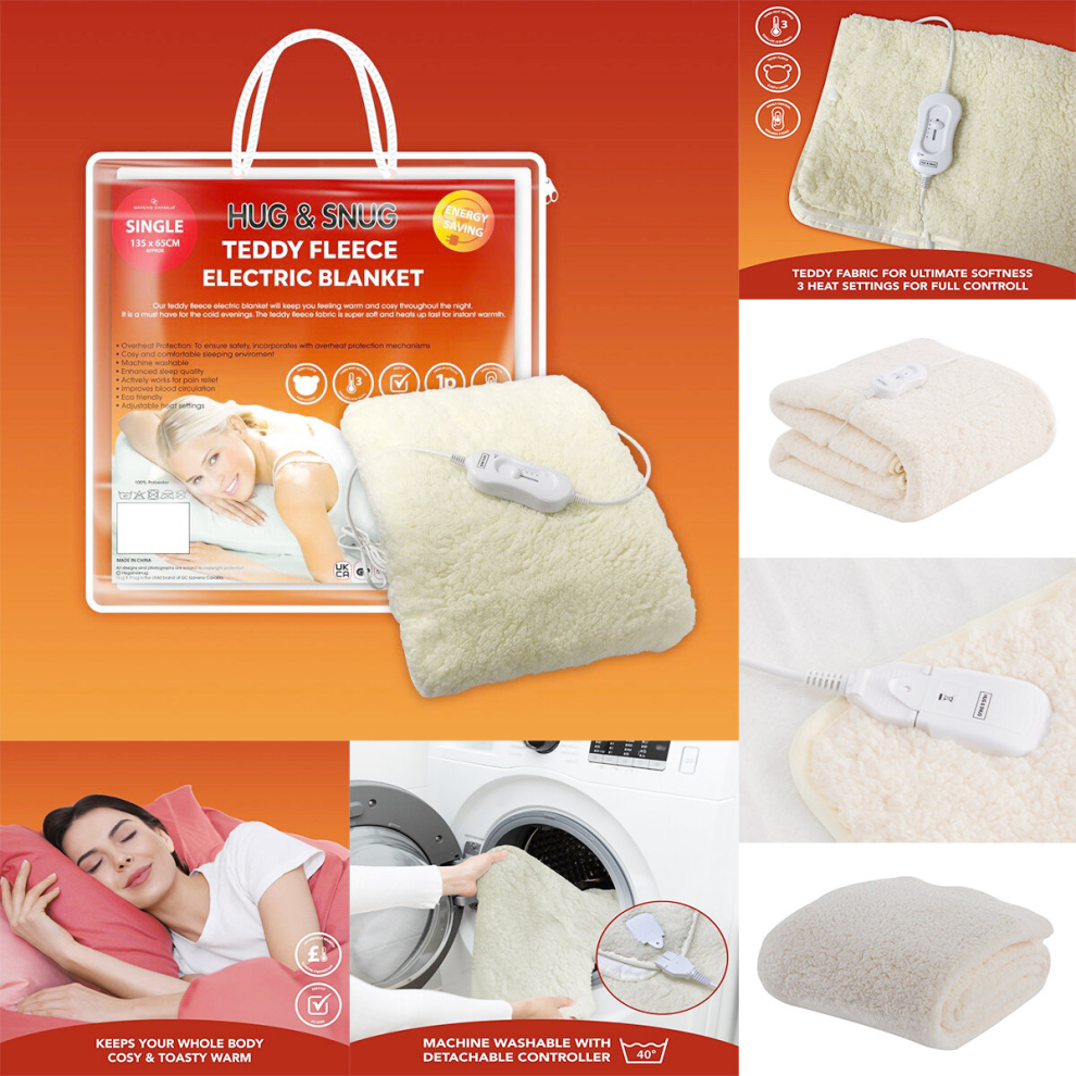 Electric Blanket SINGLE Heated Under Bed Comfort Detachable Controller 3 Heat Settings, Polyester, White Super Cosy Washable Fleece 140x70cm
