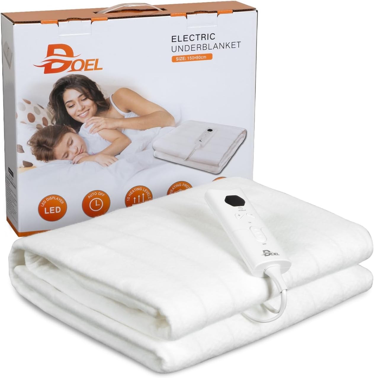 DOEL Electric Blanket Single 150x80cm, 66W Polyester Heated Underblanket with 10 Heating Levels, 3/12 Hours Auto-Off Timer and LED Display, Machine Washable, 220-230V, 50-60Hz, White