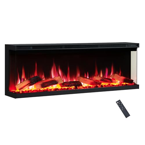 FlameKo Leura with Premium Logs 127cm/50" 3 Sided view Electric Fireplace Wall Mounted or Recessed 9 Colour Flame Effect TV Compatible Media Wall Fire Heater 900W/1800W, Remote Control