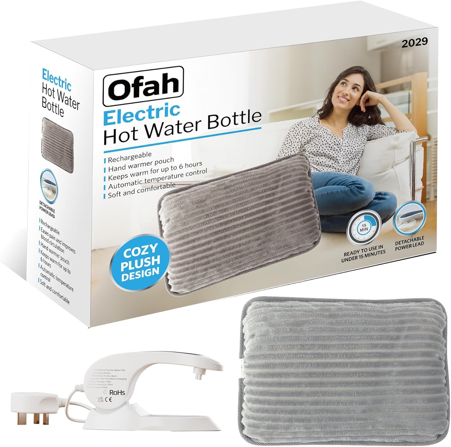 ELECTRIC RECHARGEABLE HOT WATER BOTTLE GREY BED HAND WARMER MASSAGING HEAT PAD