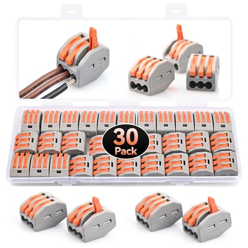 Preciva 30pcs Wire Connectors, Electrical Connector Blocks, 3 Way Compact Cable Terminals Clips Terminal Block Quick Spring, Lever Nut Assortment Conductor with Clamp 3-Port (30PCS)