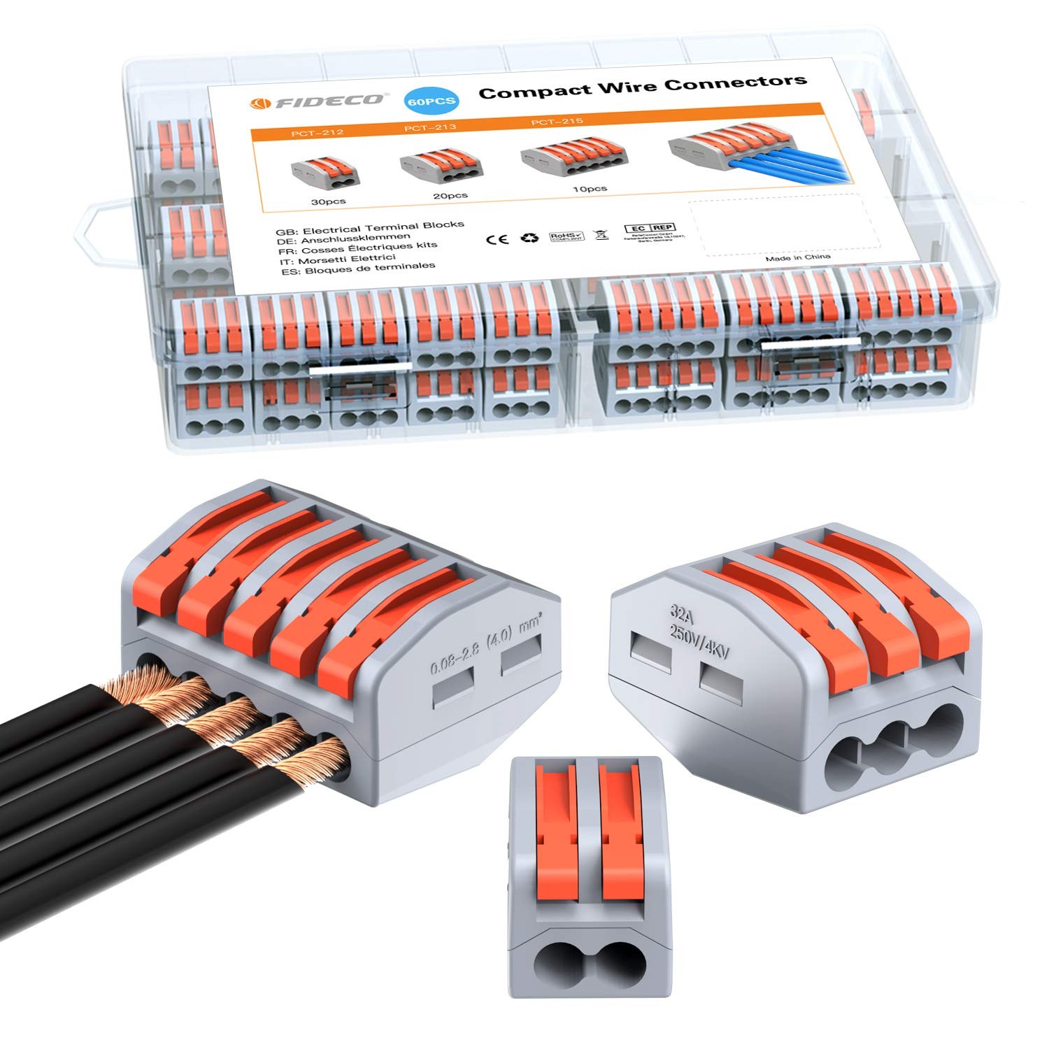 FIDECO Electrical Connector Blocks, 60 Pack Wire Connectors, Conductor Wire Clamp Terminal Block with Levers for Solid, Stranded, and Flexible Wire Cables