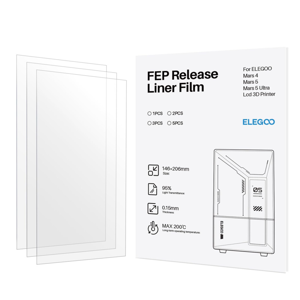 ELEGOO 5PCS FEP Release Film for Mars 4 & Mars 5 & Mars 5 Ultra Resin 3D Printer with 95% Light Transmittance, 206 * 146mm, 0.15mm Thickness