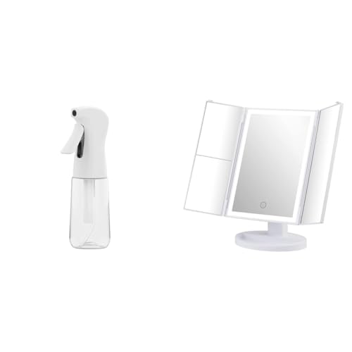 GRIFEMA Beauty Set: 32 LED Lighted Makeup Mirror with 1X/2X/3X Magnification & 200ml Ultra-Fine Mist Spray Bottle – 180° Rotating Trifold Vanity Mirror & Refillable Water Sprayer for Hair & Skincare