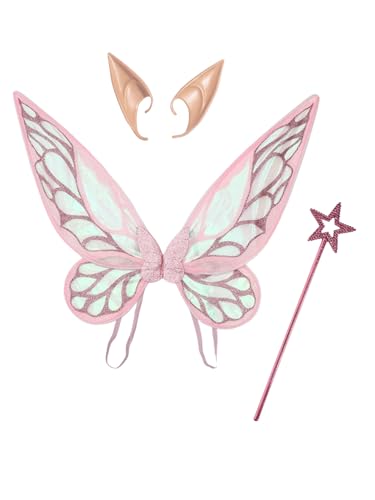Mufeng 1Set Glittery Fairy Costume Set with Butterfly Wings Elf Ears Star Stick Garland for Adults Kids Cosplay Pink One Size