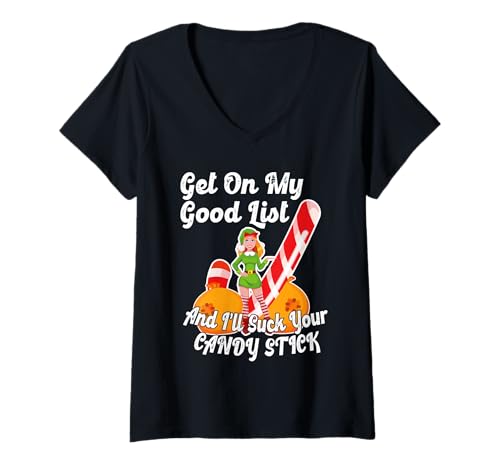 Womens Sexy Elf Good List Suck Candy Stick Rude Naughty Christmas V-Neck T-Shirt