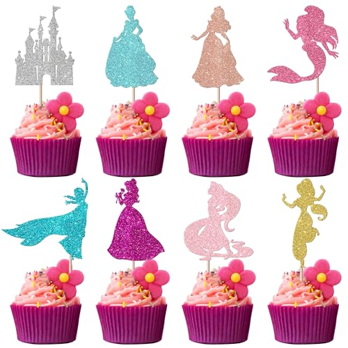 Xsstarmi 24 Pack Magical Princess Theme Cupcake Toppers Glitter Elsa Castle Bella Rapunzel Mermaid Princess Cupcake Picks for Princess Theme Girls Birthday Party Cake Decorations Supplies Pink