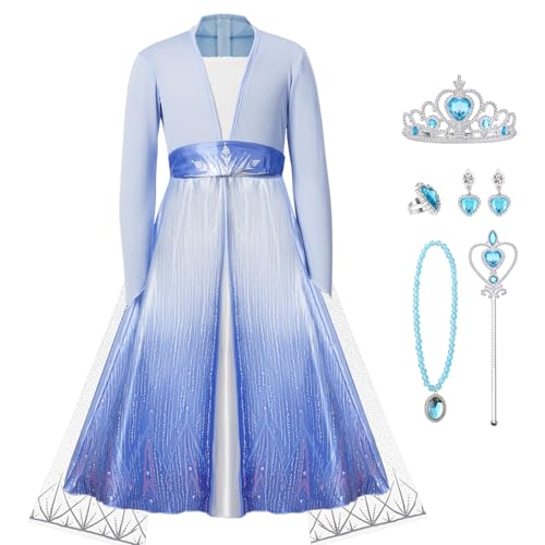 URAQT Princess Costumes for Girls Elsa Dress, Elsa Costume Outfit Dress with Princess Crown Magic Wand, Elsa Princess Costume, Deluxe Shining Cloak Fancy Dress for Halloween/Cosplay/Bridesmaid(150)