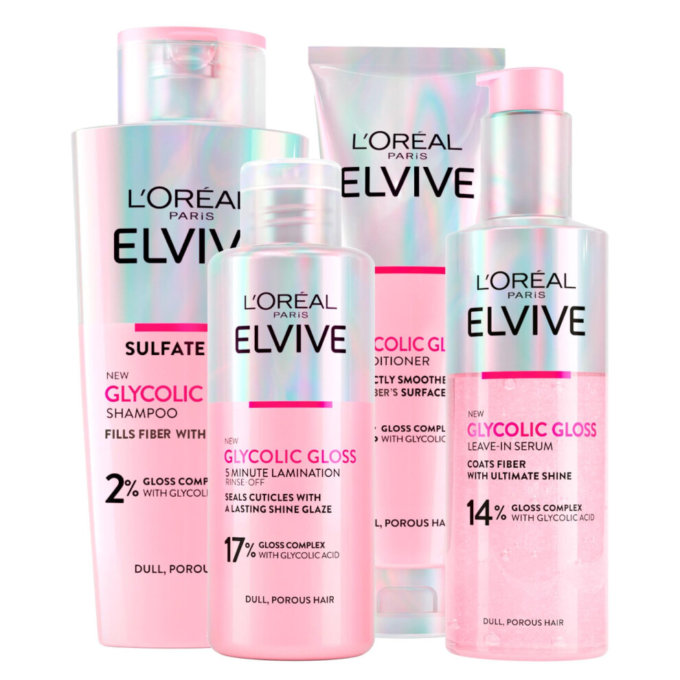 L'Oréal Paris Elseve Elvive Glycolic Gloss 150ml Conditioner + 200ml Shampoo + 150ml No-Rinse Serum + 200ml 5-Minute Laminating Treatment for Dull