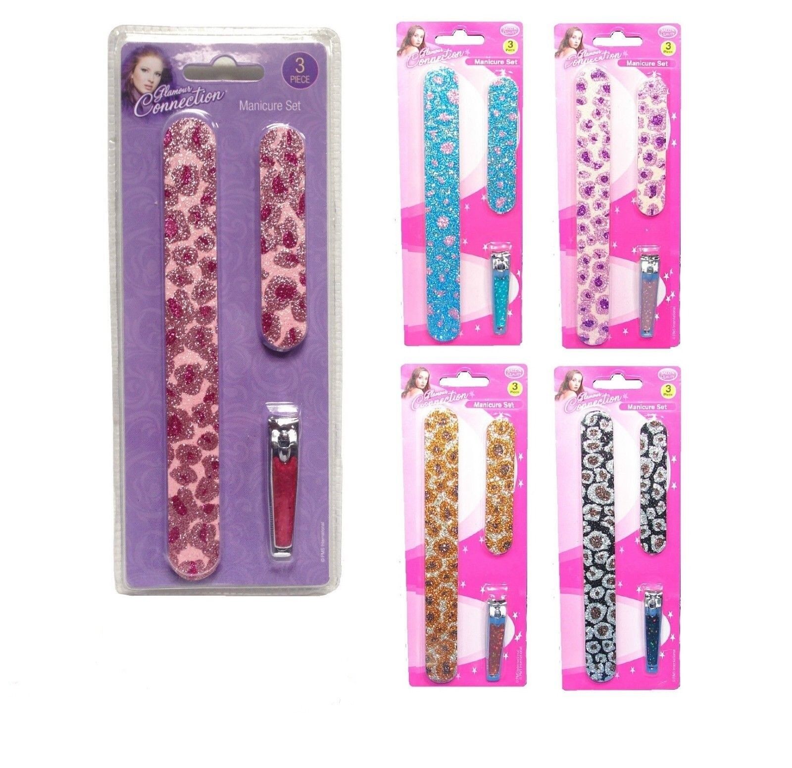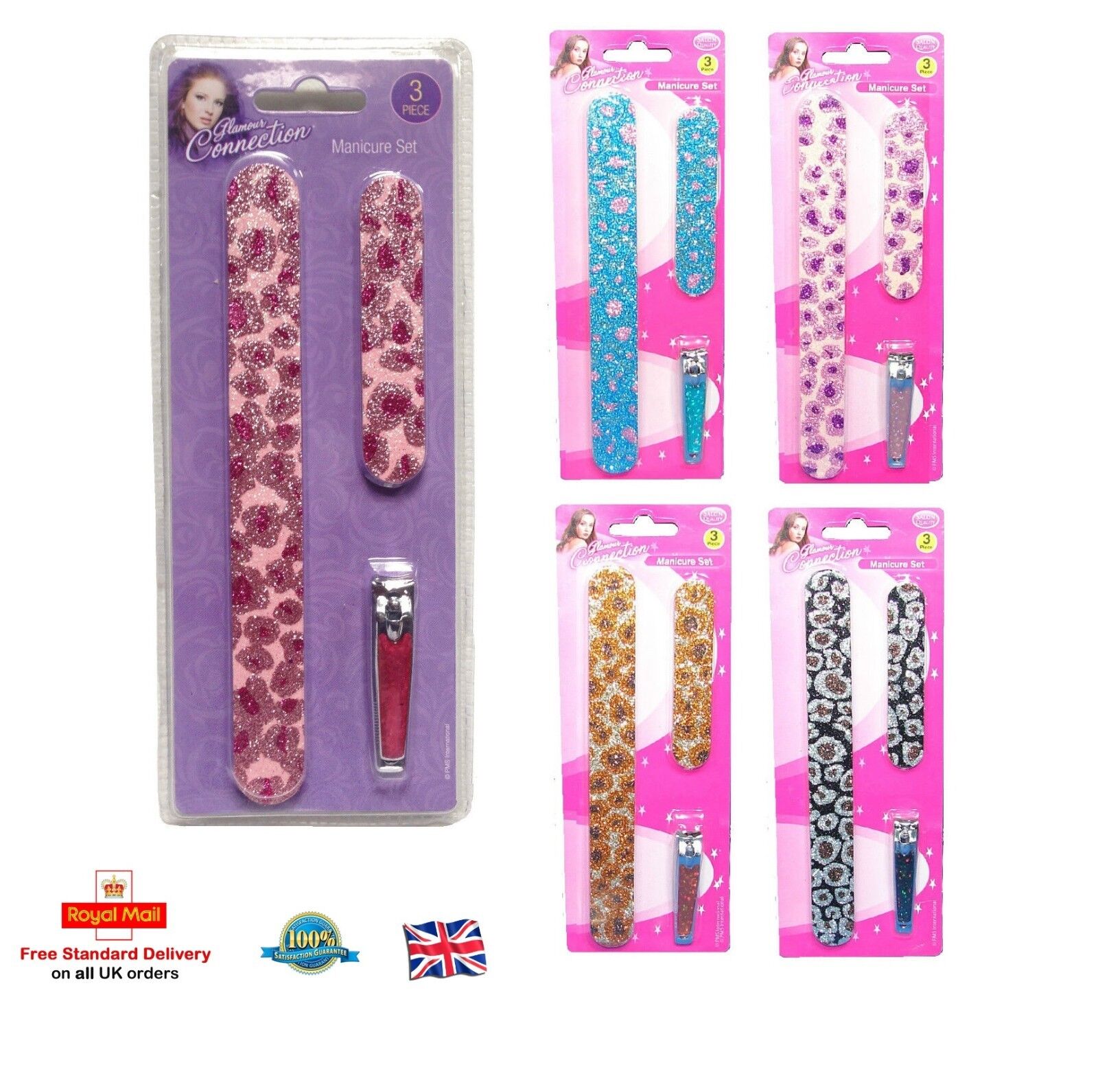 3Pc EMERY BOARDS & CLIPPER SET Sparkly Leopard Design Manicure Files Kit UK