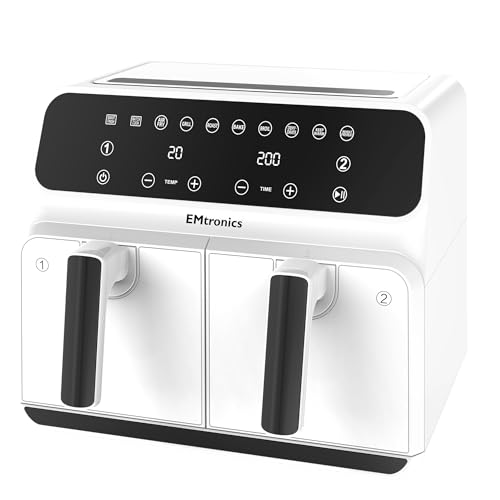 EMtronics EMAFDD8LWH Dual Air Fryer Extra Large Family Size Double XL 8 Litre with 8 Adjustable Pre-Set Menus for Oil Free & Low Fat Healthy Cooking, Easy Clean Metal Interior, 99-Minute Timer - White