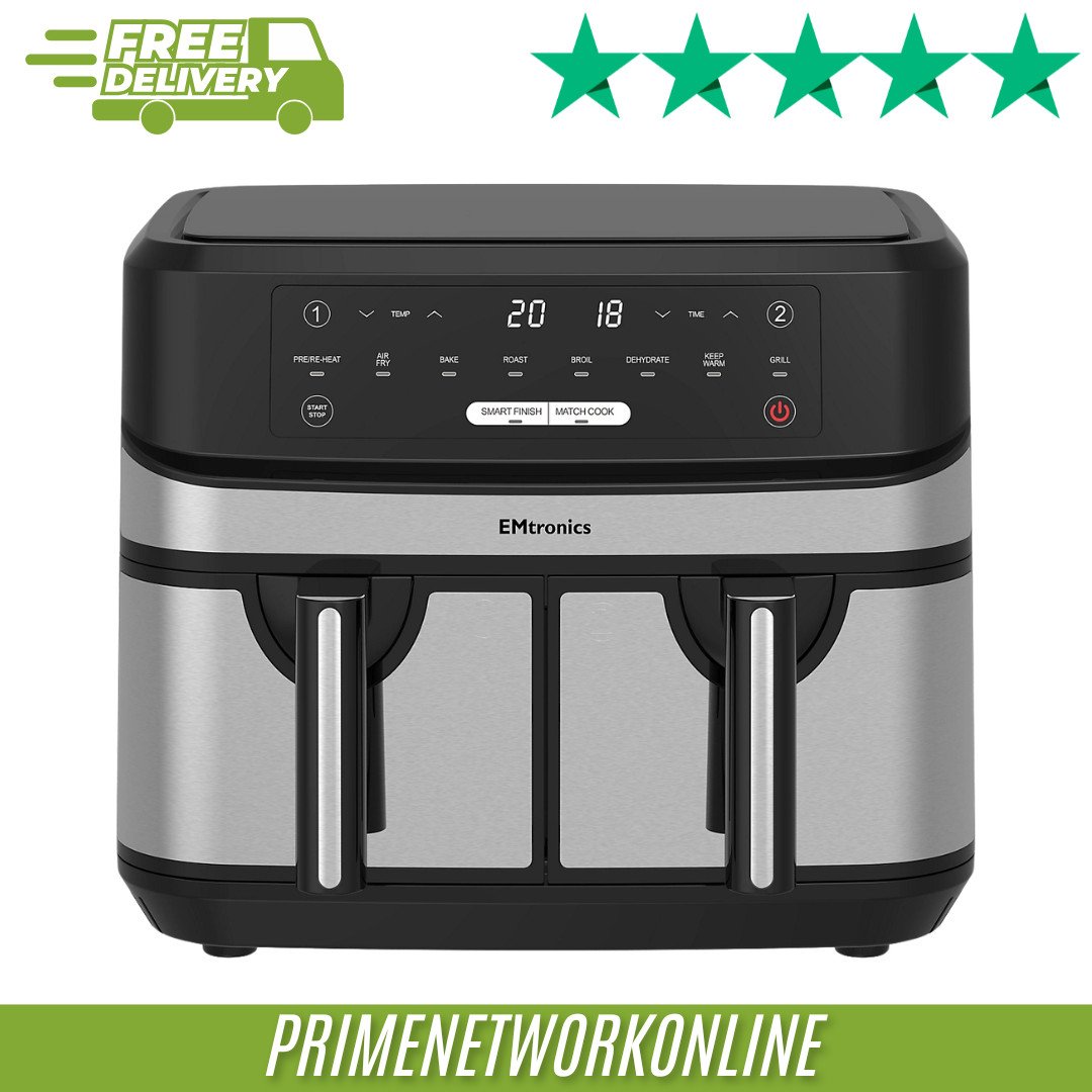 Emtronics EMAFDD9LSL Dual Air Fryer Extra Large Family Size Double XL 9 Litre wi