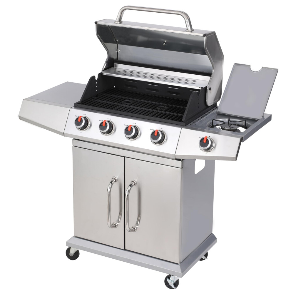 Sac 4+1 Gas BBQ Garden Grill with Enamel Cast Iron Grids, Stainless Steel Lid and Thermometer, Large Outdoor Cooking Barbeque with Storage