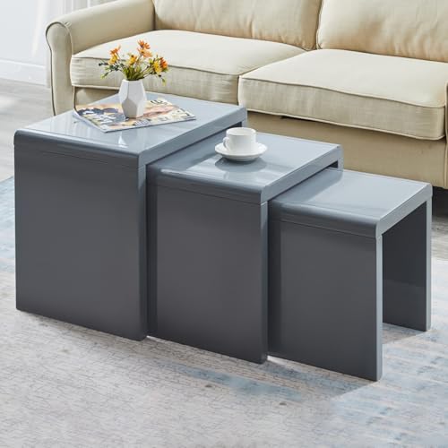 JaHECOME Nest of Tables Set of 3 Nesting Tables High Gloss Coffee Tables Stackable Design MDF Wood End Side Tables for Living Room Office or Lounge (Grey)