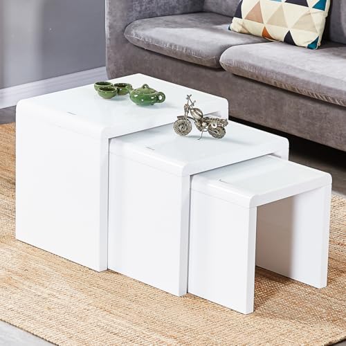 JaHECOME Nest of Tables Set of 3 Nesting Tables High Gloss Coffee Tables Stackable Design MDF Wood End Side Tables for Living Room Office or Lounge (White)