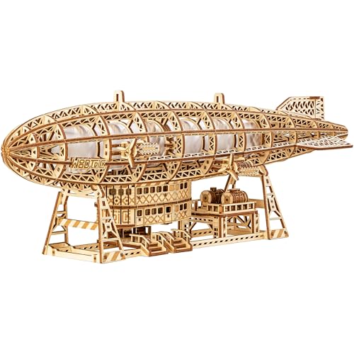 Wood Trick Luminous Zeppelin LED 3D Wooden Puzzles for Adults to Build - Moving Propellers & Tail - Includes Wall Mount & Stand - Engineering DIY Project Mechanical 3D Puzzle Model Kits for Adults
