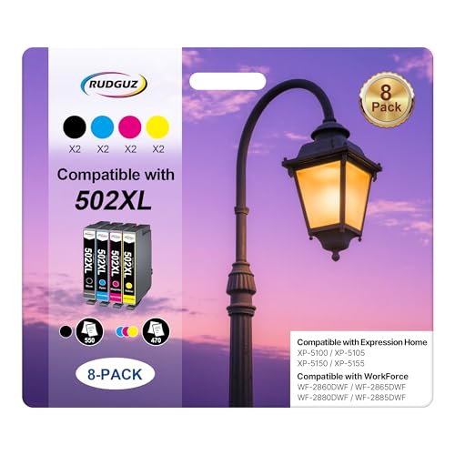 RUDGUZ 502XL Ink Cartridges Replacement for Epson 502 502XL High Yield Ink Compatible with Expression Home XP-5100 XP-5105 XP-5150 XP-5155 Workforce WF-2860 WF-2865 (8-Pack)