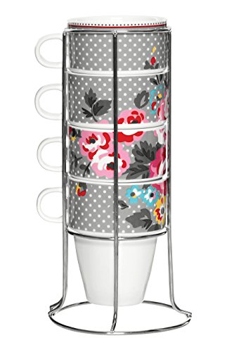 Premier Housewares 330 ml Espresso Cups Set of 4 Coffee Cups Bone China Mug Holder Chrome Stacking Cups Latte Mug 10.5x11x8.5(Each Mug)25x11x11(Stand)