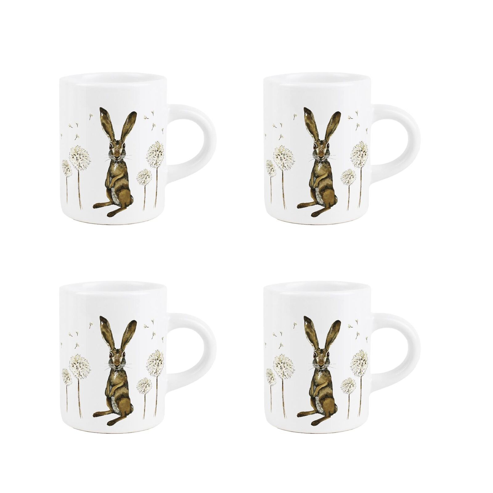 Hares & Dandelions Espresso Cups Set - Wildlife Gift Mini Ceramic Mugs Set of 4