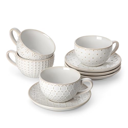 MALACASA Cups with Saucers Set, 8OZ/240ML, Stackable Espresso and Tea Cups Set for 4, Porcelain Small Espresso Coffee Cup Set, White Ceramic Mugs for Latte, Cappuccino and Americano, Serie Lydia