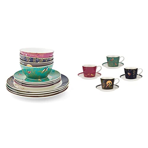 Sara Miller SMC79243-XD London Chelsea Collection 12 Piece Tableware Set, Porcelain, Gold,White & SMC79194-XG London Chelsea Collection 4 fl oz Espresso Cups & Saucers Set of 4, Porcelain