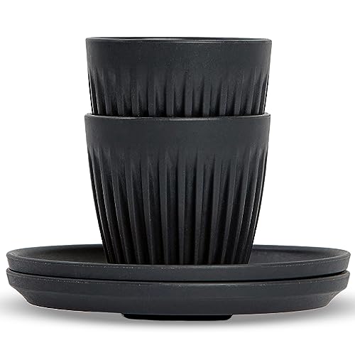 HUSKEE Espresso Cups Set of 2 - Reusable Small Coffee Cups with Unique Fins for Espresso & Macchiato - Insulated Espresso Cups with Saucers Made with Repurposed Coffee Husks - 3 oz., Charcoal