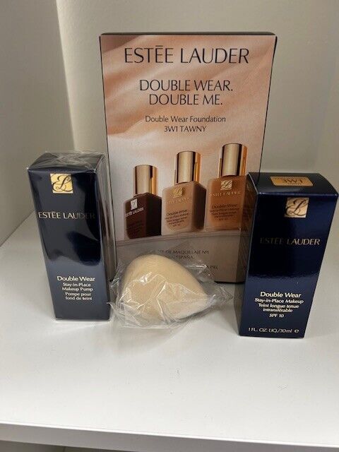 Estee Lauder Double Wear Foundation Set inc 3W1 Tawny, pump, makeup sponge