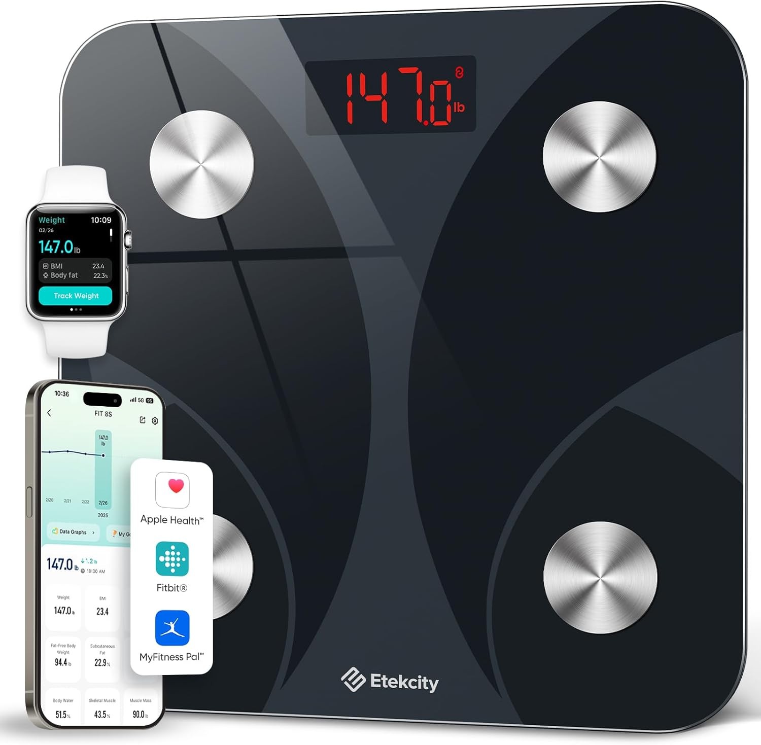 Etekcity Scales for Body Weight, High Precision 0.1lb Bathroom Digital Weighing Scale with Phone App & Bluetooth, Smart Body Composition Monitor for BMI, Body Fat, Muscle Mass, Durable Glass Ash-black