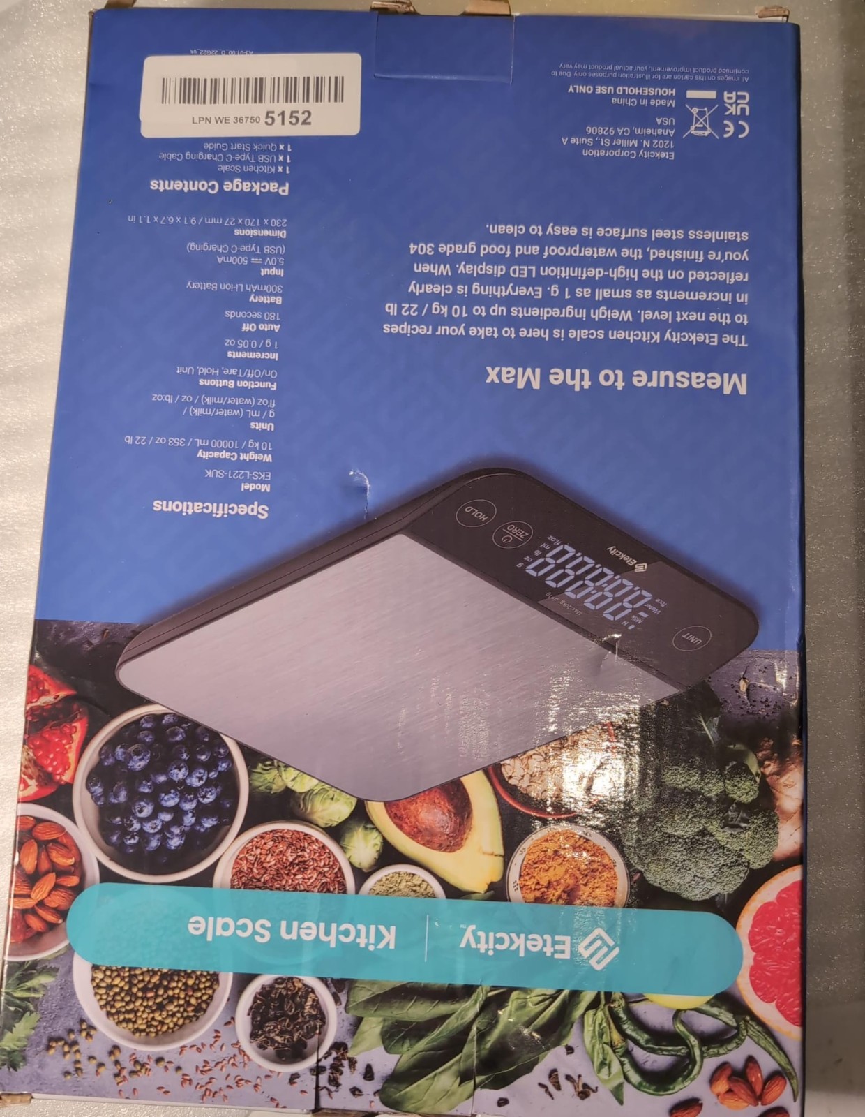 Etekcity 10Kg Waterproof Digital Kitchen Scale with USB Rechargeable LED Display