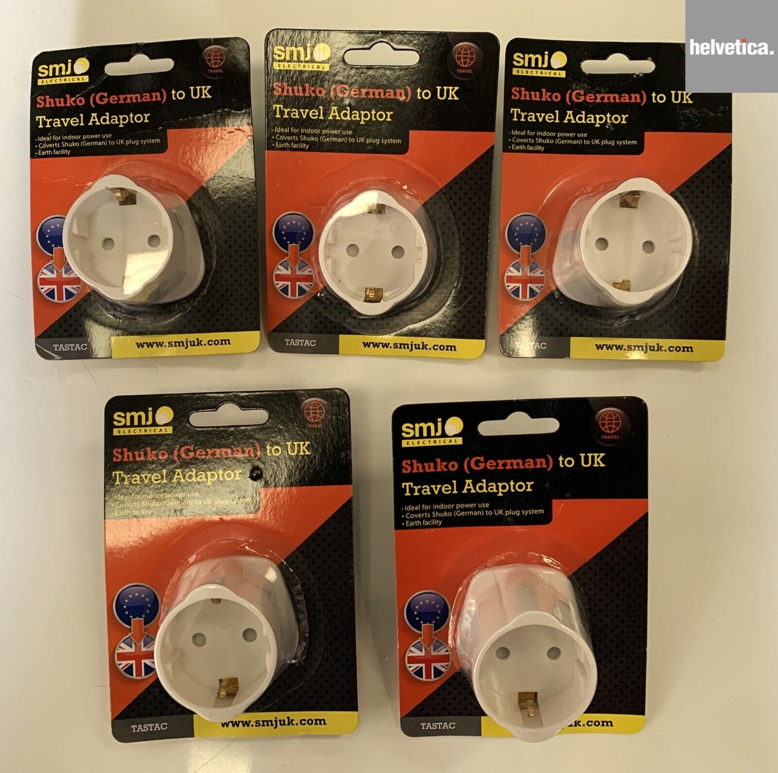 5 SMJ Travel Adaptor Plugs EU to UK Converts Euro 2 Pin Schuko to UK Mains 3 Pin