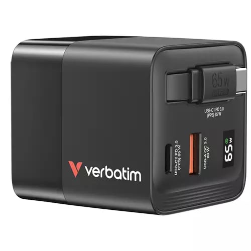 Verbatim GaN Charger 65W 2 Port retractable cable display US plugs with EU and UK adaptors