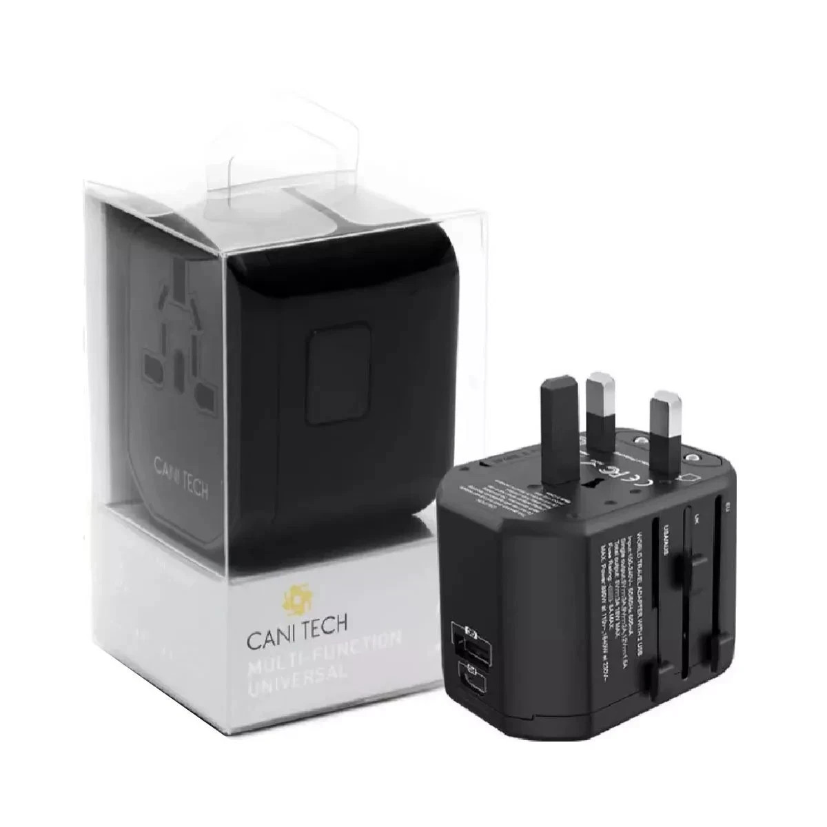 Black Travel Adapter Worldwide Cani Tech 18w US/UK/EU/AUS Plugs 8A DUAL FUSE