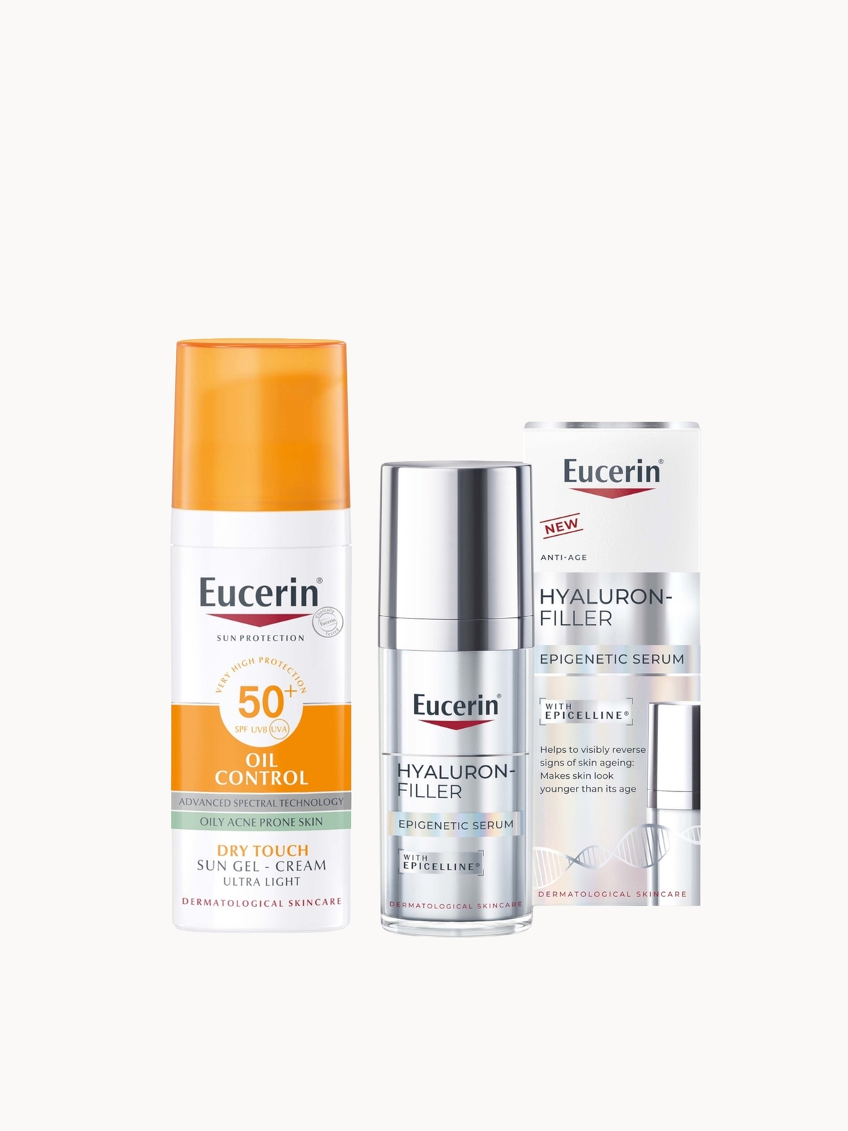 Eucerin Hyaluron-Filler Epigenetics Serum 30ml & Sun Face Oil Control 50ml Gel Bundle to Protect & Reverse signs of ageing