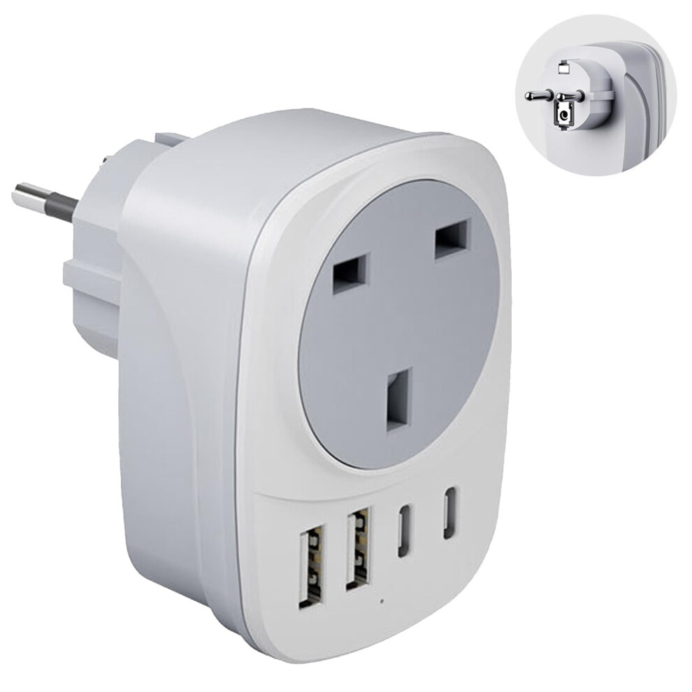 UK to European Plug Adapter with 2 USB Ports and 2 USB C, European Travel Adapter Plug Extender,Grounded European Plug Adapter