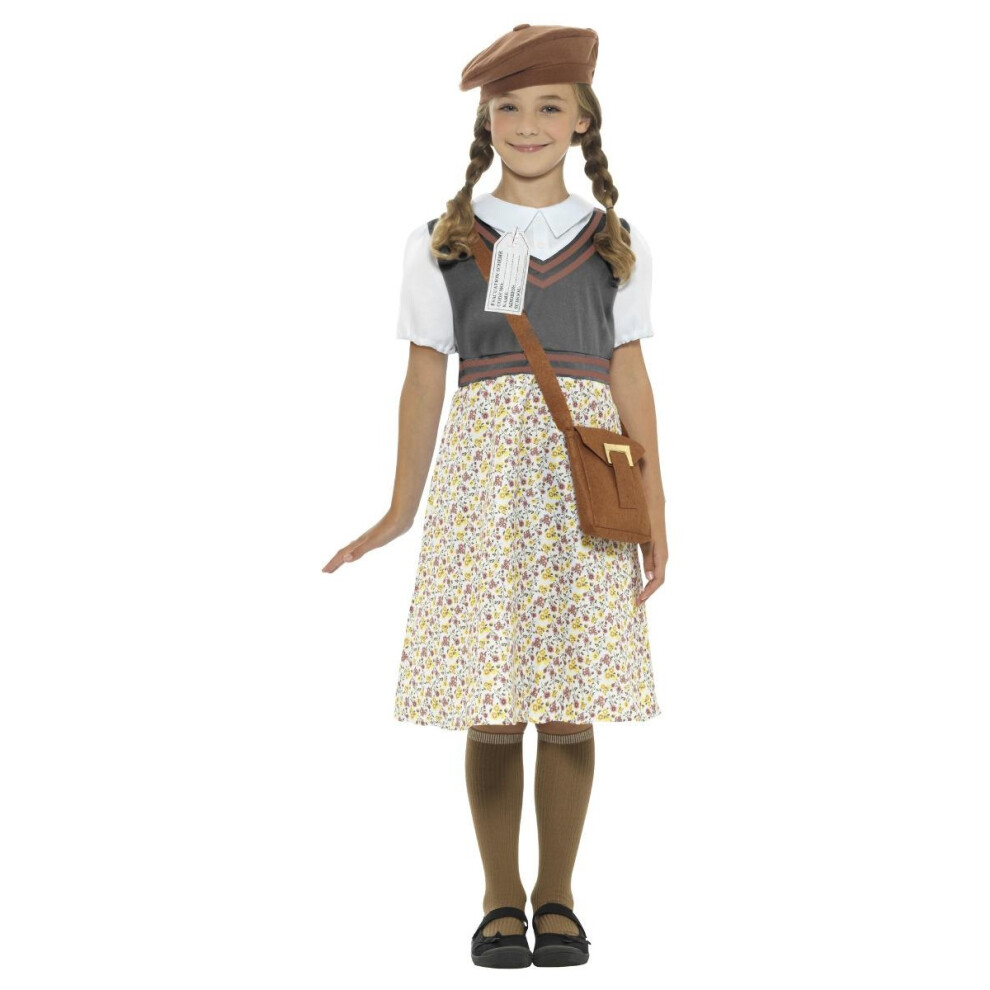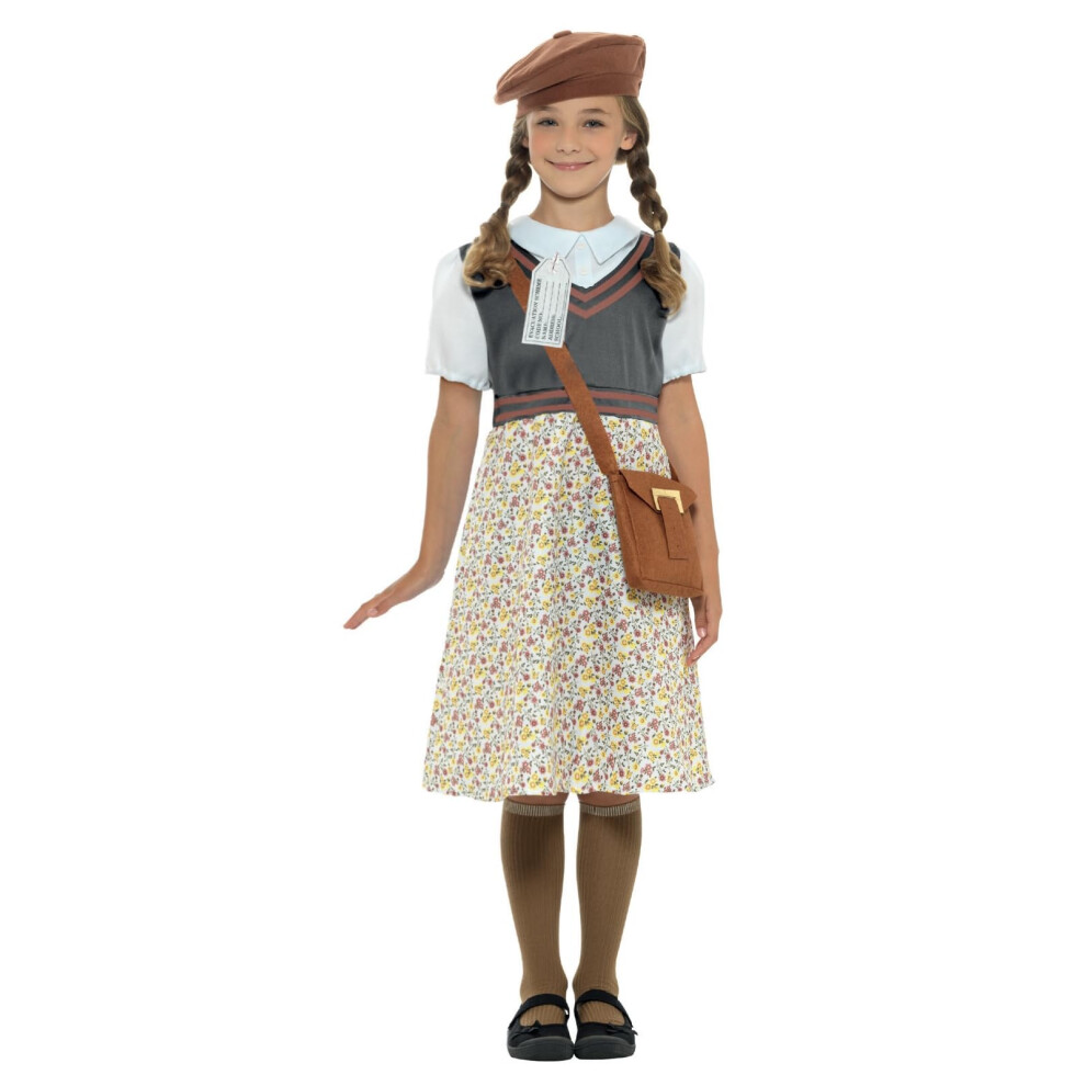 Smiffys Evacuee Girl Costume, Patterned with Dress, Satchel, ID Tag & Beret, Fancy Dress, Child Dress Up Costumes