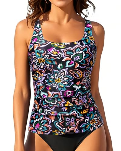 Aqua Eve Tankini Tops for Women Swimwear Top Only Tummy Control Bathing Suit Top No Bottom (Available in Plus), Black and Colorful Flower, Medium