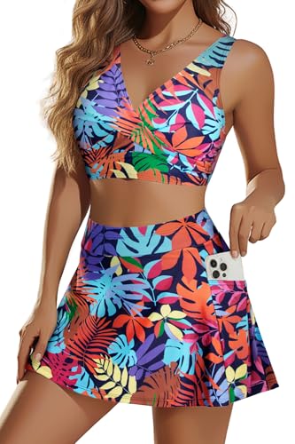 Aqua Eve Two Piece Bikini Skirt Swimsuit - 2 Piece Bathing Suits for Women High Waisted with Pockets 2024 Swimwear, Colorful Leaves, XL