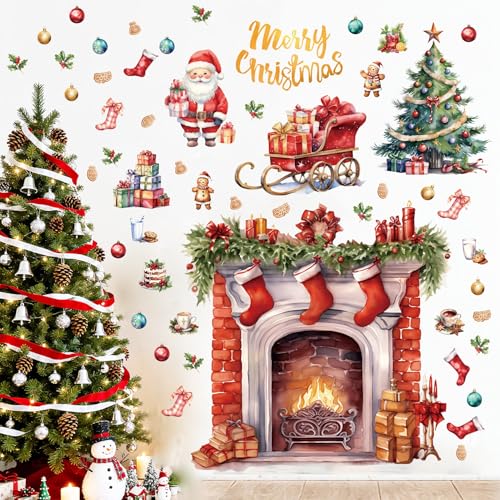 KAIRNE Large Hearth Fireplace Wall Decals Gold Merry Christmas Wall Decor Cartoon Santa Claus Hanging Stickers Grinch Xmas Tree Window Clings Christmas Eve Home Decorations for Living Room 90X60CM
