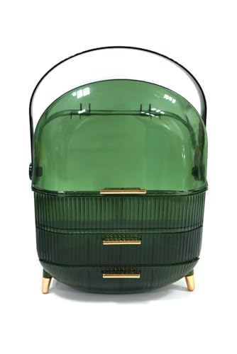 Luxury Makeup Organiser with Drawers – Green Vanity Box with Lift-Up Lid, Gold Trim, Portable Handle & Storage for Skincare, Cosmetics & Perfume – 38x25x18.5cm