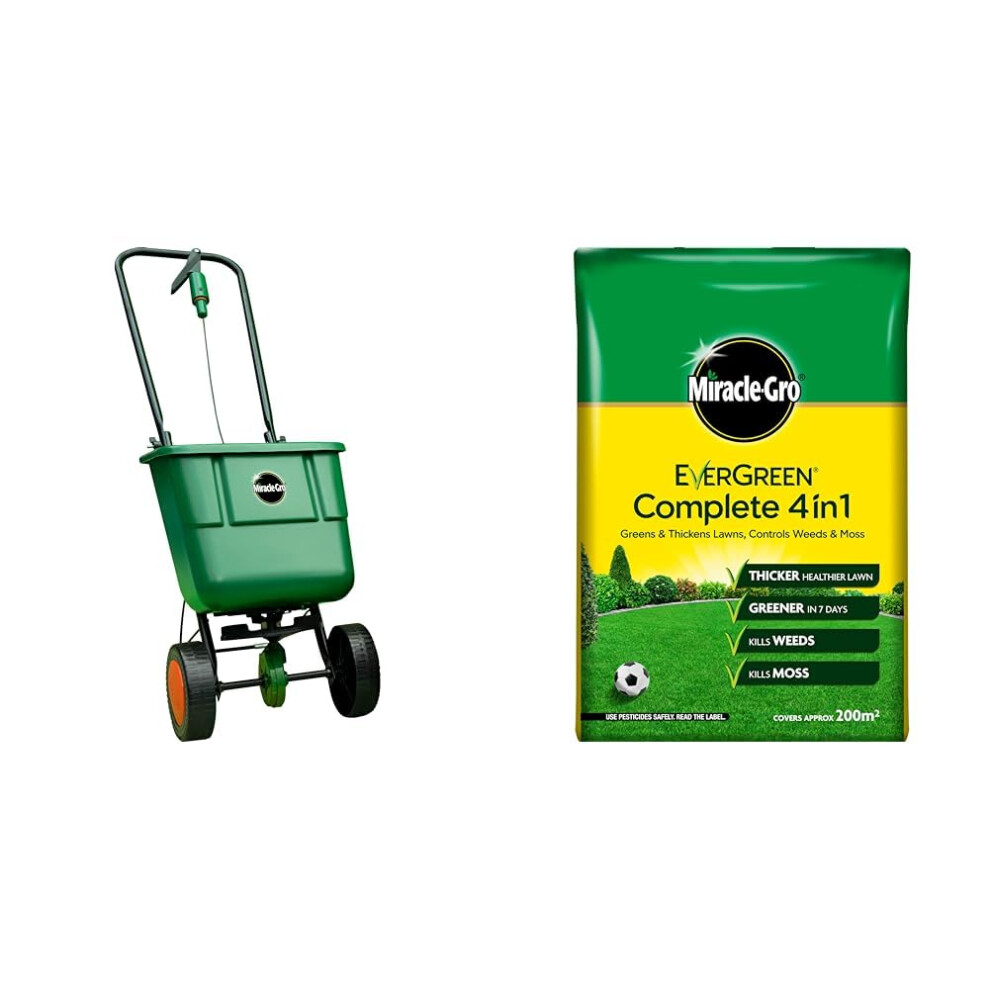 Miracle-Gro Lawn Seed Drop Spreader & Evergreen Complete 4-in-1 Lawn Food - 200 m2, Lawn Food, Weed & Moss Control,