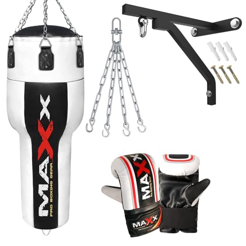 Maxx BLACK WHITE uppercut punch bag, body bag angled boxing bag Set heavy filled bag 4FT punching bag (BAG WITH BRACKET & MITTS)