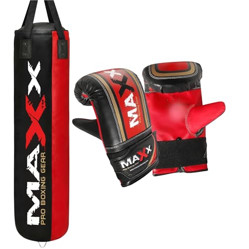 Maxx Black and Red 3ft 4ft 5ft 6ft Filled Hanging Boxing Punch Bag Set Heavy Punching bag (BAG + MITTS, 5FT)