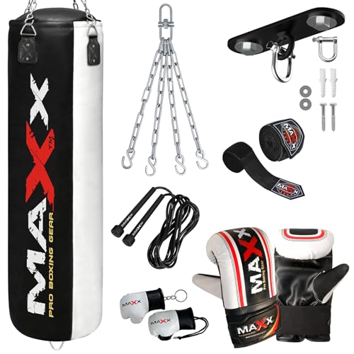 Maxx Black/White Boxing Set 6ft 5ft 4ft 3ft Heavy Filled Punch Bag Gloves Wall Bracket or Ceiling Hook Free Chain Boxing Set (Empty Bag +Chain, 5 FT)