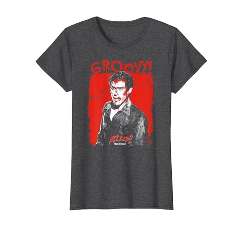 Evil Dead 2 Ash Williams Bloody Groovy Horror Comedy T-Shirt, Women, Dark Heather Grey, Medium