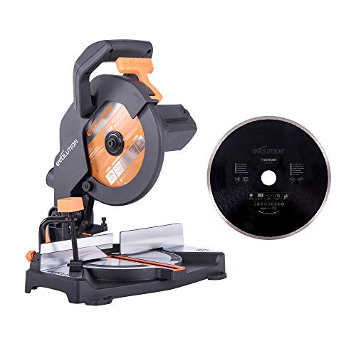 Evolution Power Tools 046-0002A R210CMS Compound Saw with Multi-Material Cutting, Bevel, 45 Degree Mitre, 3-Year Warranty, 1200 W, 110 V-Site Use