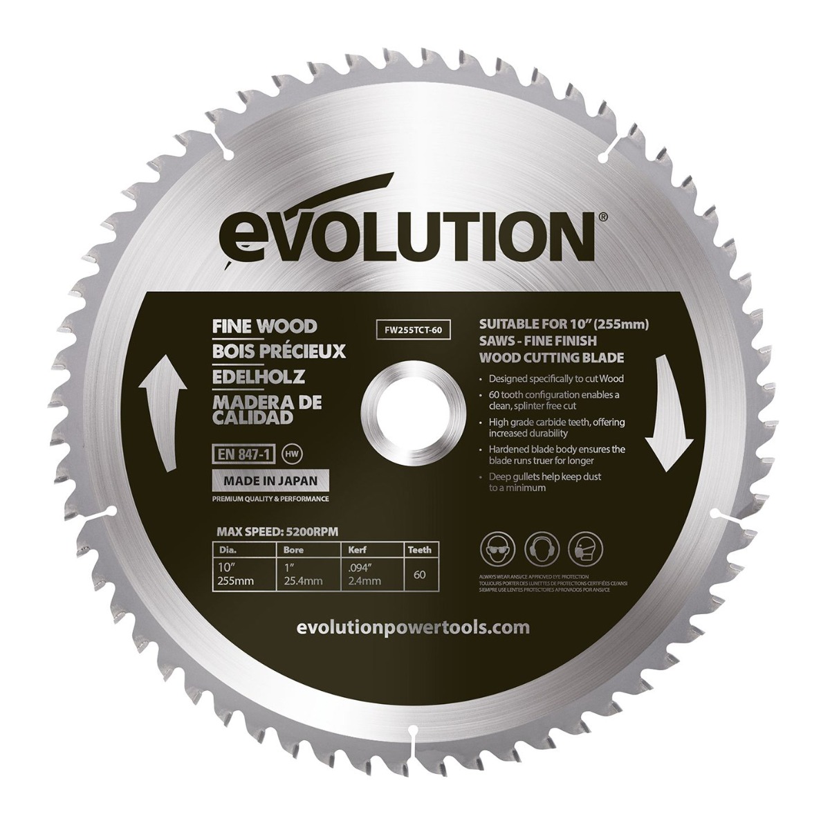 Evolution Power Tools FW255TCT-60 Fine Finish Wood Cutting TCT Tungsten Carbide Saw Blade, For Mitre & Table Saws, Smooth Fast Cuts In Sheet, Ply & Hardwood, Clean, Splinter Free Cut, 60 Teeth, 255mm