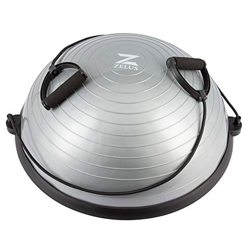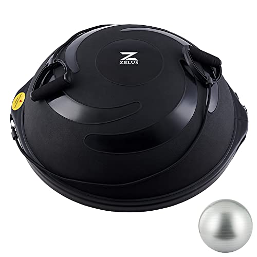 ZELUS 64cm Balance Ball | 680kg Inflatable Half Exercise Ball Wobble Board Balance Trainer w Nonslip Base | Half Yoga Ball Strength Training Equipment w 2 Bands, Pump, Extra Ball Included (Black)