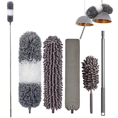 Fogray 5PCS Extendable Feather Duster, Bendable Microfiber Duster with Extra Long 100'' Telescopic Extension Pole and Soft Silicone Cap, Washable Duster for Cleaning Roof, High Ceiling Fan, Blinds
