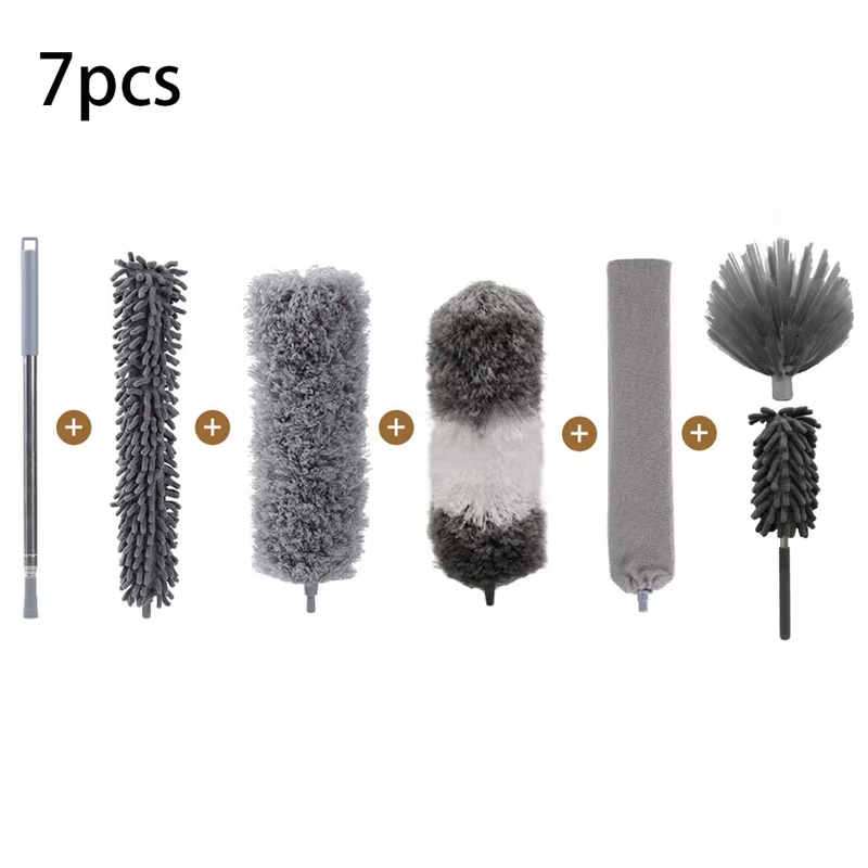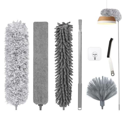 Fogray Extendable Feather Duster Kit - Long Handled 100" Telescopic Pole and Soft Silicone Cap, Bendable Washable Heads for Cleaning Cobwebs, High Ceiling Fans, Roof, Furniture & Cars(7Pcs-Grey)