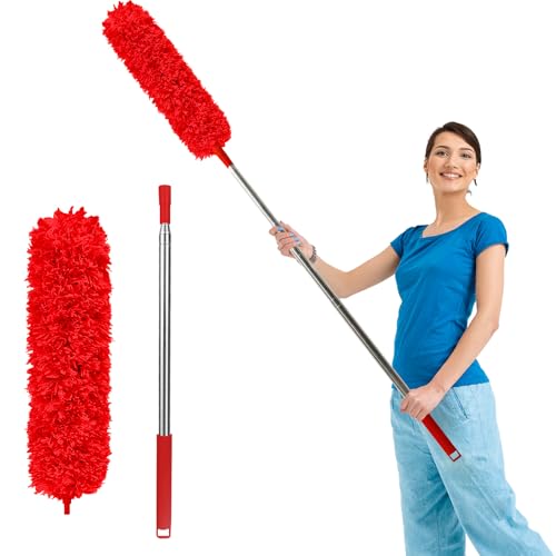OFFCUP Feather Duster, Extendable Microfiber Duster with 96" Stainless Steel Telescopic Pole and Bendable Head, Long Handled Dusters for Cleaning Cobweb High Ceiling Fan Roof Blinds Cars (Red)